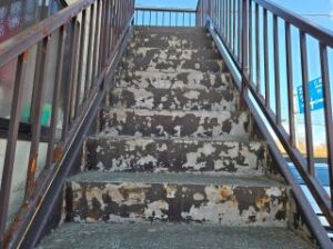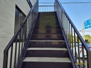 外壁同様に階段の劣化も進んでおり、鉄部や蹴り込み部分もサビや塗膜の剥がれが目立っていました。