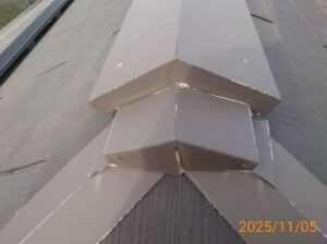 屋根材が合わさる部分を覆っていて、雨水などが内部に入って来ないように防いでいる役割もあります。
