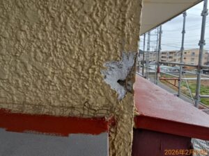 築年数が経過しているモルタル外壁はひび割れや欠損箇所も見受けられます。