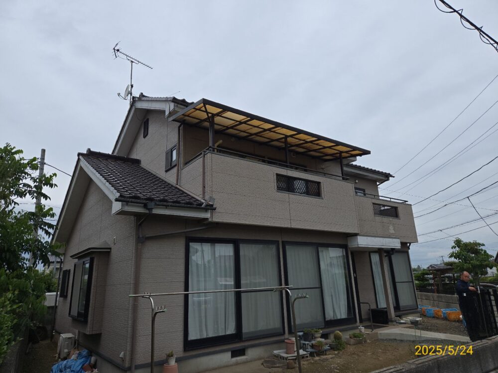 | 使用材料 | 外壁:ミズタニ ナノウォール15 21-30D色 3分ツヤ ベランダN-70色 外壁金属サイディング: ニチハ金属製外装材 影光Ⅱ ブルクブラウン・ライトグレー 破風板: プレミアムNADシリコン 19-70C 5分ツヤ 軒天: ケンエース 19-70C つや消し コーキング: オートンイクシード |