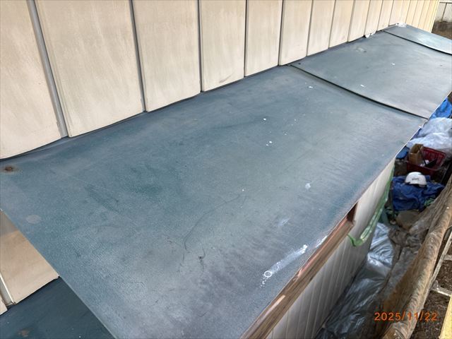石岡市 雨漏りしていた物置屋根の葺き替え工事