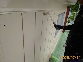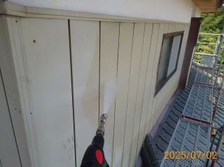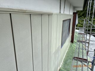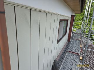 | 使用材料 | 外壁: スーパーボーセイエポサビ止め・クリーンマイルドシリコン SR-407色 破風板: プレミアムNADシリコン SR-423色 軒天: ケンエース N-90色 屋根: スーパーボーセイエポサビ止め・プレミアムルーフSi RC-103色 木部: キシラデコール スプルース色 |