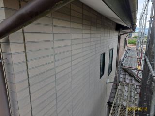 | 工事内容 | 足場架設・高圧洗浄・養生 ↓ 。外壁目地コーキング ・サッシまわりコーキング ・外壁塗装 外壁補修+エポキシ樹脂シーラー下塗り+シリコン2回塗り ・雨樋・破風板・戸袋塗装 目粗し作業+プレミアムNADシリコン2回塗り 軒樋破損部部分交換 ・軒天塗装 下地調整+防カビアクリル塗装2回塗り ・屋根塗装 下地調整+エポキシ樹脂シーラー下塗り+シリコン2回塗り ・付帯部塗装 ↓ 養生バラシ・最終チェック・足場解体・清掃 |