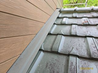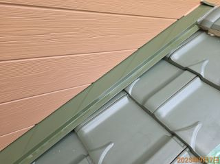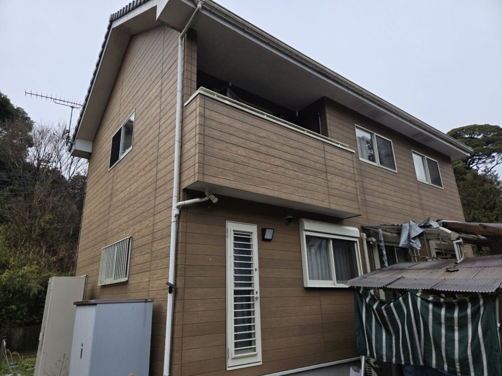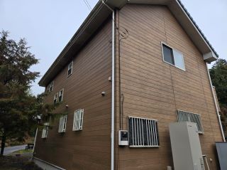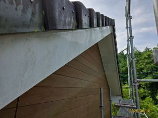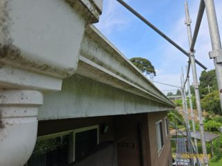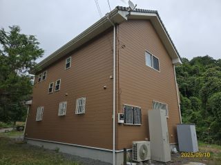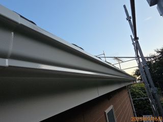 | 使用材料 | 外壁: ミズタニ ナノウォール15 17-30F色 3分艶 破風板・雨樋: プレミアムNADシリコン SR-103色 軒天: ケンエース N-90色 |